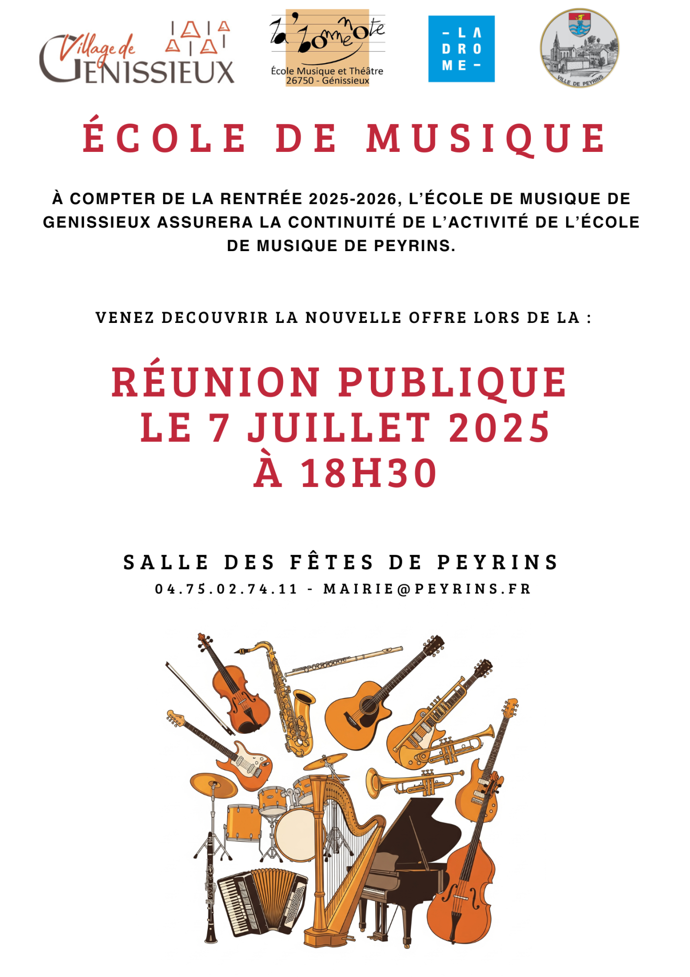 Après la fermeture de l'école de musique par le conseil municipal, l'école de musique de Génissieux se propose de reprendre l'activité de l'école avec le soutien de la mairie de Peyrins.